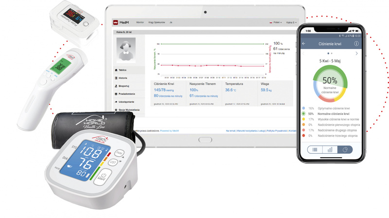 Dzięki aplikacji/witrynie MedM Health, dostępnej również w języku polskim, mogą Państwo zarządzać informacjami o swoim ciśnieniu, saturacji krwi SpO2, wadze i składzie ciała oraz temperaturze w jednej aplikacji. Inteligentne aparaty HOME-WORLD będą łatwo połączone przez Bluetooth, a przesyłanie danych z urządzenia pomiarowego do sprzętu mobilnego i/lub komputera w czasie rzeczywistym jest niezwykle proste i zajmuje tylko chwilę. Wyniki można łatwo udostępnić osobom trzecim np. rodzinie, opiekunowi lub lekarzowi.