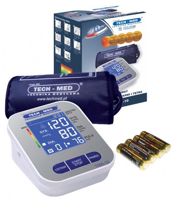 Ciśnieniomierz TMA-10 TECH-MED jest nowoczesnym, w pełni automatycznym, cyfrowym urządzeniem o zaawansowanej technologii. Naciśnięcie przycisku po założeniu mankietu powoduje, że aparat mierzy ciśnienie krwi oraz tętno i wyświetla wyniki na wyświetlaczu cyfrowym. TMA-10 wykrywa również objawy arytmii. Ergonomiczny wyświetlacz LCD zapewnia łatwy odczyt wyniku pomiaru.