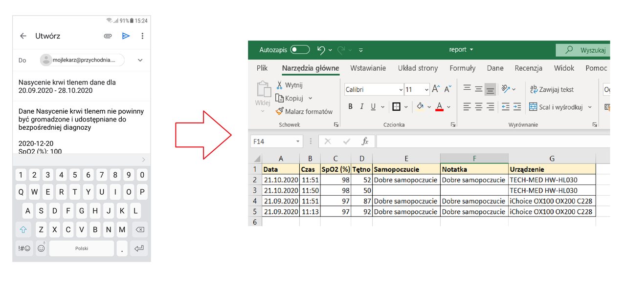 The MedM Health app is a very convenient tool for automatically recording blood oxygenation and pulse measurement results. With the MedM Health app, you can forget about the tedious manual recording of results. You have complete measurement results with you in your smartphone at all times. With the MedM Health app, you can send the complete history of your measurements to a selected email address, such as your doctor's or family members'. You can describe each measurement result in such a way that your doctor receives information about the impact of the recommended drug therapy on your measurement results.