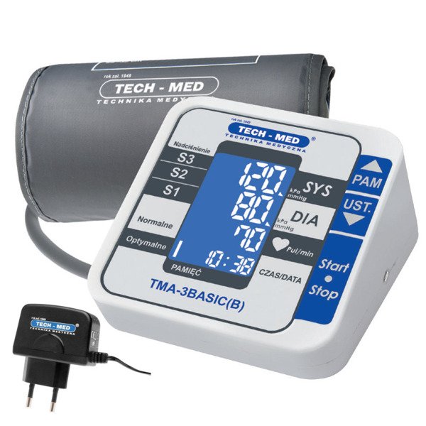 TECH-MED TMA-3 BASIC (B) to nowoczesny ciśnieniomierz elektroniczny, w którym zastosowano oscylometryczną metodę pomiaru z zastosowaniem technologii MWI (Measuring While Inflating). Ciśnieniomierz charakteryzuje się wysoką dokładnością pomiaru – równorzędną dokładności pomiarów dokonywanych metodą osłuchową za pomocą sphygmomanometrów mechanicznych przez wykwalifikowany personel medyczny. Dokładność ta została potwierdzona badaniami klinicznymi. Wykonanie dokładnego pomiaru ciśnienia jest niezwykle proste – wymaga przyciśnięcia tylko jednego przycisku. Ergonomiczny wyświetlacz LCD zapewnia łatwy odczyt wyniku pomiaru