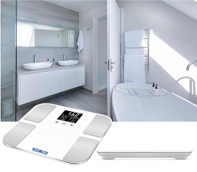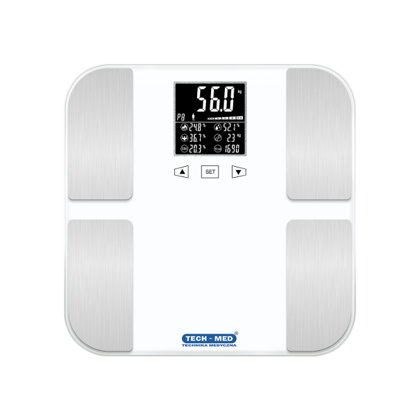 - Waga TECH-MED TM-WA002 z funkcją pomiaru zawartości tkanki tłuszczowej, mięśniowej, kostnej i wody w organizmie. Na podstawie analizy wzrostu, wagi, wieku, urządzenie podaje dzienne zapotrzebowanie energetyczne i pomaga kontrolować masę ciała.