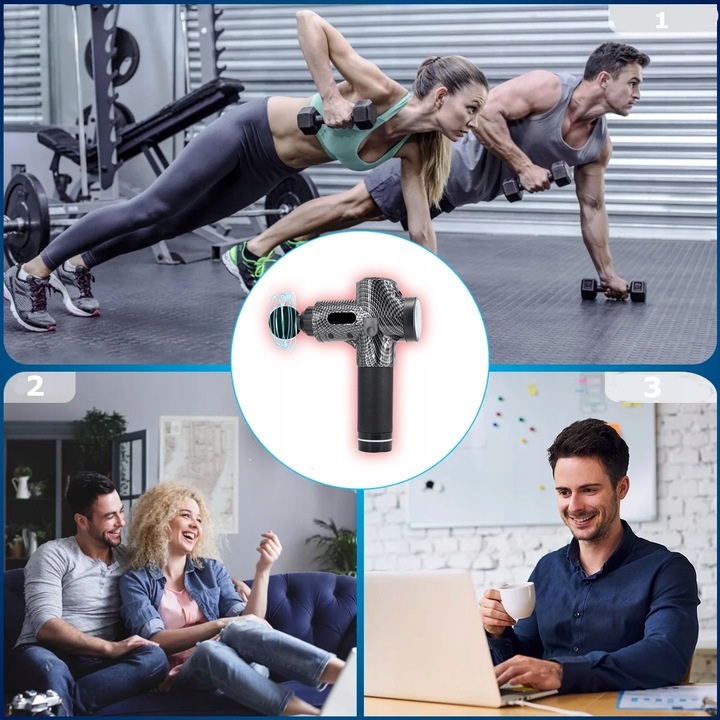 Nawet na najwyższym poziomie prędkości, masażer jest cichy i dlatego możesz z niego korzystać na siłowni (1), w domu (2) czy w biurze (3) – nie uprzykrzając życia postronnym osobom.
